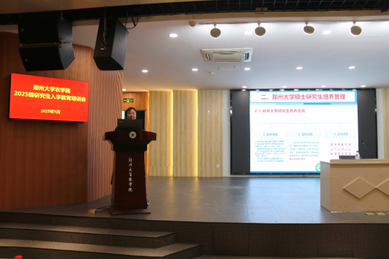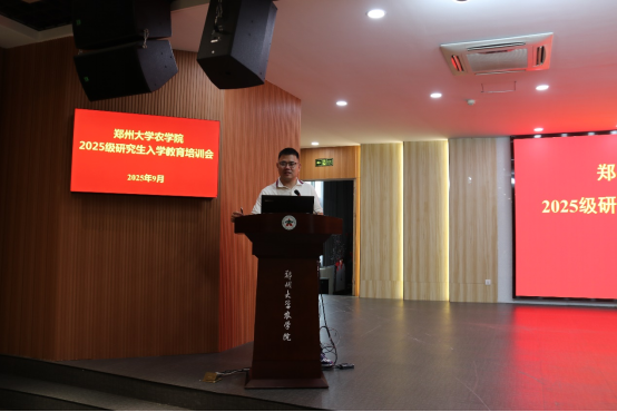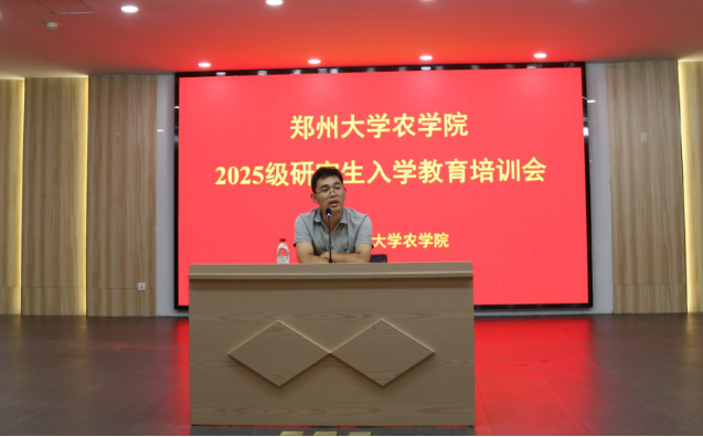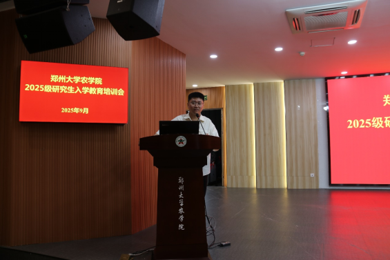 为帮助2025级研究生新生深入了解学校与学院发展概况,明确学业科研方向,快速融入校园生活,2025年9月8日-9月14日,郑州大学农学院在313报告厅举办2025级研究生入学教育培训会。党委书记苏伟、执行院长焦浈、党委副书记段武俊、副院长位芳、教学办公室主任庞会利和2025级辅导员殷湘坤出席会议,2025级全体硕士研究生和博士研究生参加会议,会议由团委书记冯小杰主持。