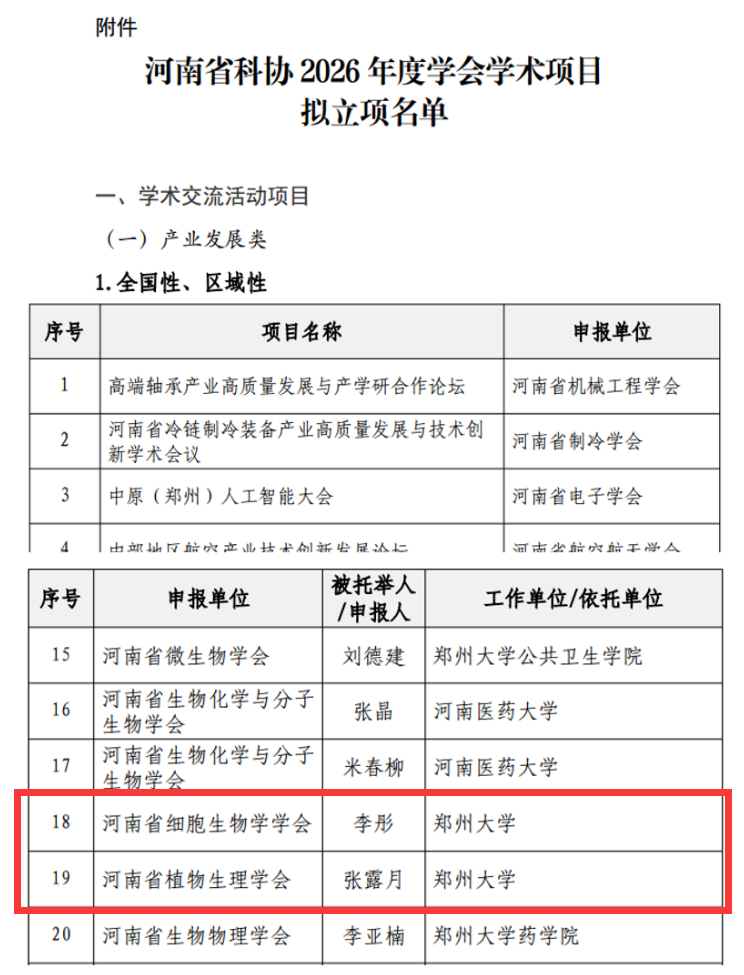 近日,河南省科学技术协会正式公示了2026年度学会学术项目拟立项名单。经单位申报、形式审查、专家评审及会议研究等多轮严格遴选,全省共有261个项目脱颖而出,成功进入拟立项名单。我院品种分子设计研究所张露月老师、农业大数据与气候智慧型农业研究所李彤老师,成功入选“青年人才托举工程”拟立项名单。