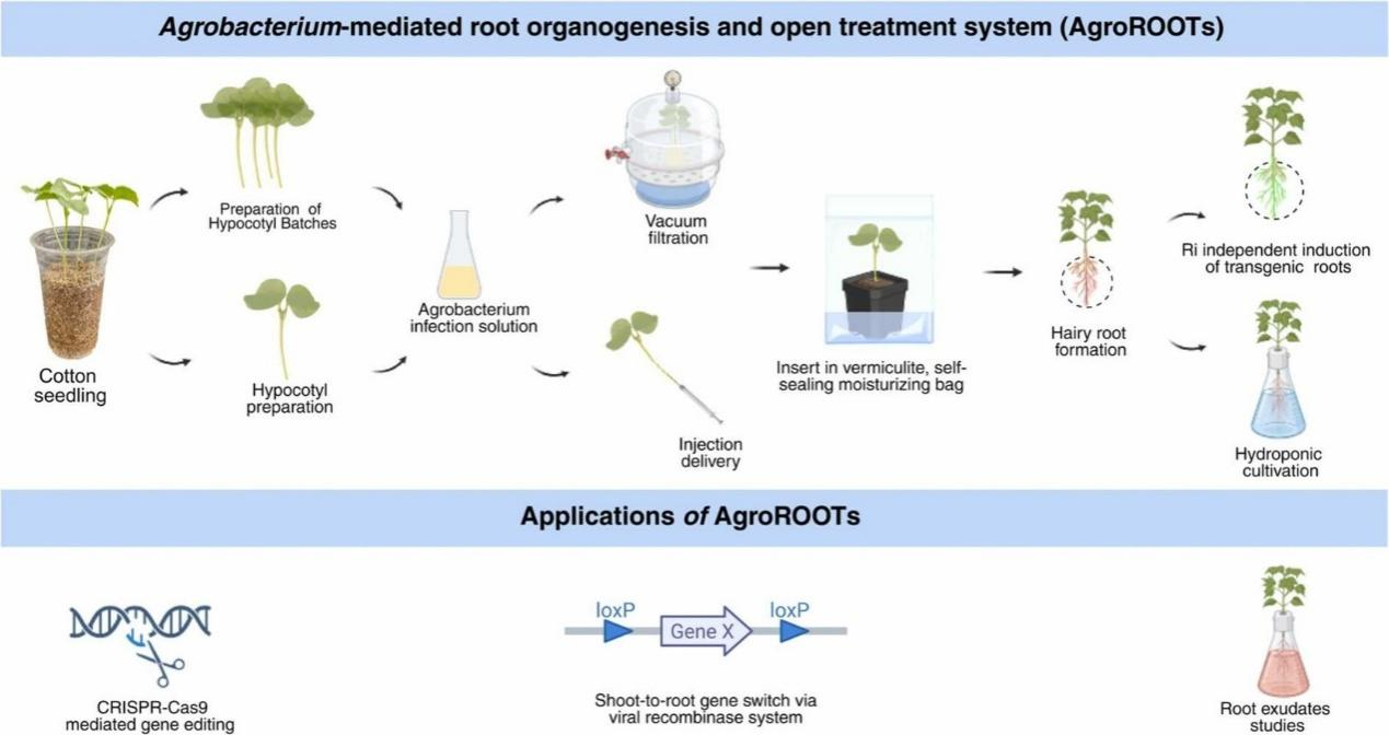 根系在植物吸收养分、水分及应对环境胁迫中发挥着重要作用。但是,由于缺乏简单、高效、稳定的研究体系,植物根系功能研究一直是植物科学领域的难点。近日,郑州大学农学院师恭曜团队在《Industrial Crops & Products》上发表最新研究成果“Agrobacterium-mediated root organogenesis and open treatment system (AgroROOTs) for root functional genomics studies in cotton”。该研究在棉花中建立了一套全流程、全周期开放的毛状根转化应用系统,彻底释放了毛状根在植物根系功能基因组学研究中的应用潜力,并建议统一毛状根转化应用实验体系名称为AgroROOTs,为植物根系功能研究提供了简易高效的技术路径。