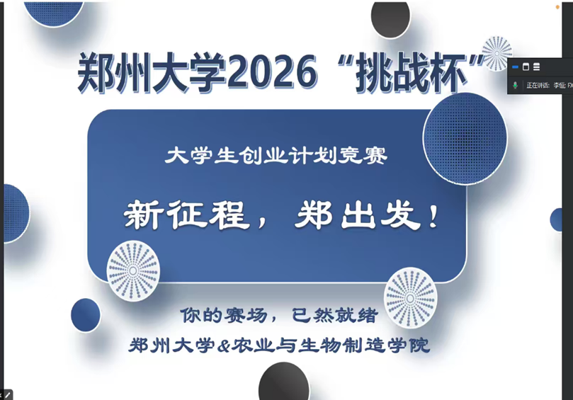 2025年11月9日,农业与生物制造学院成功举办挑战杯经验分享会。农业与生物制造学院团委书记冯小杰和2025级辅导员殷湘坤参加分享会,会议由2025级团支书李恒主持,组织委员姚志云担任宣讲人。本次宣讲会重点讲解参赛流程、团队组建、参赛重点内容的准备等相关事项,特邀2024级挑战杯河南省特等奖团队负责人乔陆羽分享参赛经验,为同学们答疑解惑。
