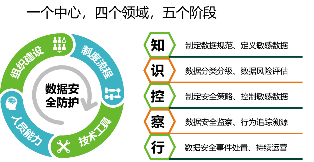 我们依据《数据安全法》建立数据安全管理制度和数据开发利用的规则,管理和技术双管齐下,全面贯彻我们“智慧安全3.0”理念,充分利用和发挥各种关键技术的作用,构建全场景、可信任、实战化的数据安全纵深防御预警体系,贴合客户需求,形成场景化的数据安全解决方案,达到“全面防护,智能分析,自动响应”的数据安全防护效果。我们坚持以数据安全防护为中心,在组织建设、制度流程、技术工具及人员能力四个领域开展数据安全建设工作,通过“知、识、控、察、行”五个步骤实现能力落地,引入新技术来优化技术和管理流程,通过实现自动化和半自动化以降低数据安全与数据开发利用的运营成本,从而确立数据安全管理制度,提升数据安全治理与开发利用的技术水平,有效的应对数据安全风险与挑战,在保障数据安全的同时让数据价值最大化。