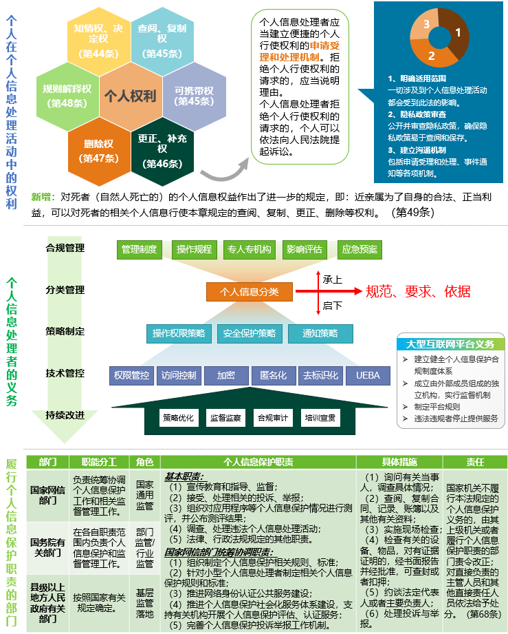 本法涉及个人、个人信息处理者、监管部门三大强相关的主体,如下图所示,分别就个人权利、个人信息处理者的义务、监管部门所履行个人信息保护职责进行阐述。
