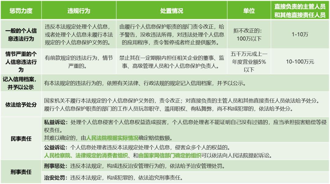 近年来,有关个人信息权益侵权案件逐渐增多,比如“告知—同意”的认定、人格权纠纷、人脸识别等与个人信息主体强相关的权益。因此,本法在这方面加强了监管和提高了惩处力度。本法规定了“一般的个人信息违法行为”和“情节严重的个人信息违法行为”,虽然对这两者没有严格的界定和说明,但可参照以往的司法案例或借鉴GDPR相关处罚案例。详细惩处要求如下图所示: