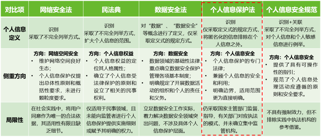 为了便于对《个人信息保护法》进一步理解,本文通过列表的方式对国内强相关的几部法律法规进行横向对比,如下图所示。本文对照仅限于非法律专业视角进行对照,因此严格意义上来说不能准确对比分析法律效力位阶的相关问题。