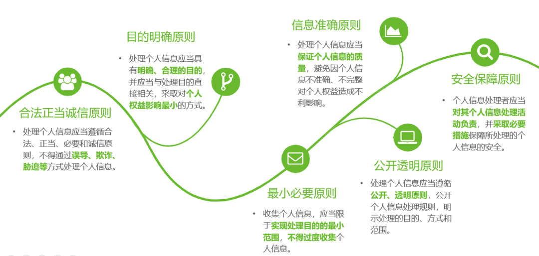 在“第一章 总则”部分,进一步明确了处理个人信息的基本原则,本文参考相关法律法规,结合企业实践,总结了以下六大基本原则。