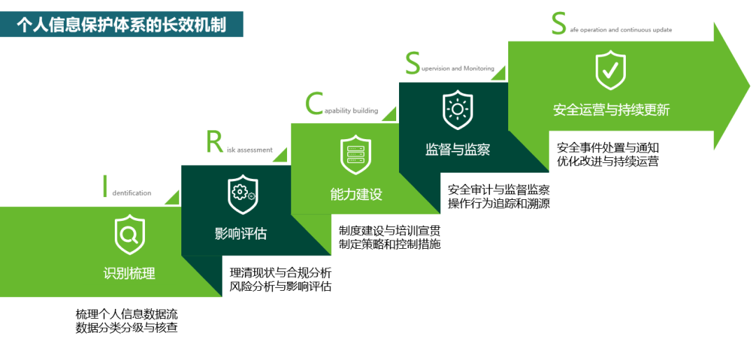2021年可谓是数据保护元年,《数据安全法》《个人信息保护法》《关键信息基础设施安全保护条例(国务院令第745)》等一系列法律法规的颁布和即将实施,标志着我国在数据安全和个人信息保护方面正式进入2.0时代。而数据安全和个人信息保护密不可分,就像是一对孪生兄弟。针对个人信息保护的应对思路,可在数据安全建设的基础上进行专项设计和实施,形成个人信息保护体系的长效机制(IRCSS)。该机制主要通过五个方面进行个人信息安全落地建设,帮助组织确立管理制度和操作流程,全面了解个人信息安全状况,提升个人信息安全监测与防护措施,通过优化改进与持续运营,实现持续自适应的个人信息安全防护能力。