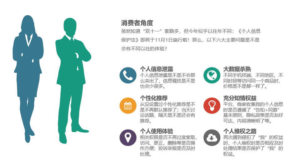 近年来,“双十一”网购狂欢的同时, 也是个人信息泄露的高峰。《个人信息保护法》恰好也将在2021年11月1日施行,面对今年的“双十一”,消费者、商家、互联网平台运营者、监管部门等该如何使用《个人信息保护法》赋予的权益,又该如何履行《个人信息保护法》规定的责任呢?接下来,本文尝试站在这四类主体的角度来思考如何面对。
