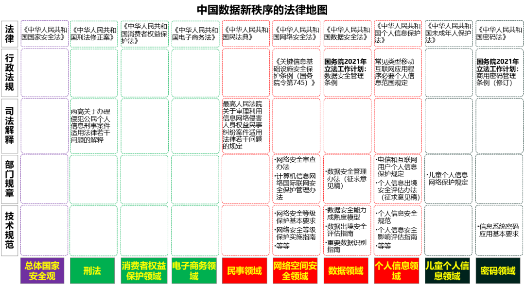 本文从国家法律、行政法规、司法解释、部门规章、技术规范五个层面入手,梳理国内数据安全与个人信息保护相关制度,整理形成可直观查看的“中国数据新秩序的法律地图”。