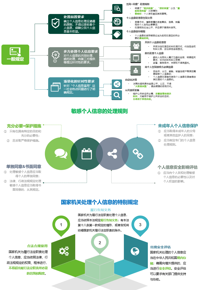 个人信息处理规则:包括了一般规定、敏感个人信息的处理规则、国家机关处理个人信息的特别规定三个方面。需要注意的是,本法确立以“告知—同意”为核心的个人信息处理规则,同时也新增了同意的例外事由,如《个人信息保护法》第十三条中提到的“前款第二项至第七项规定情形的,不需取得个人同意” 。