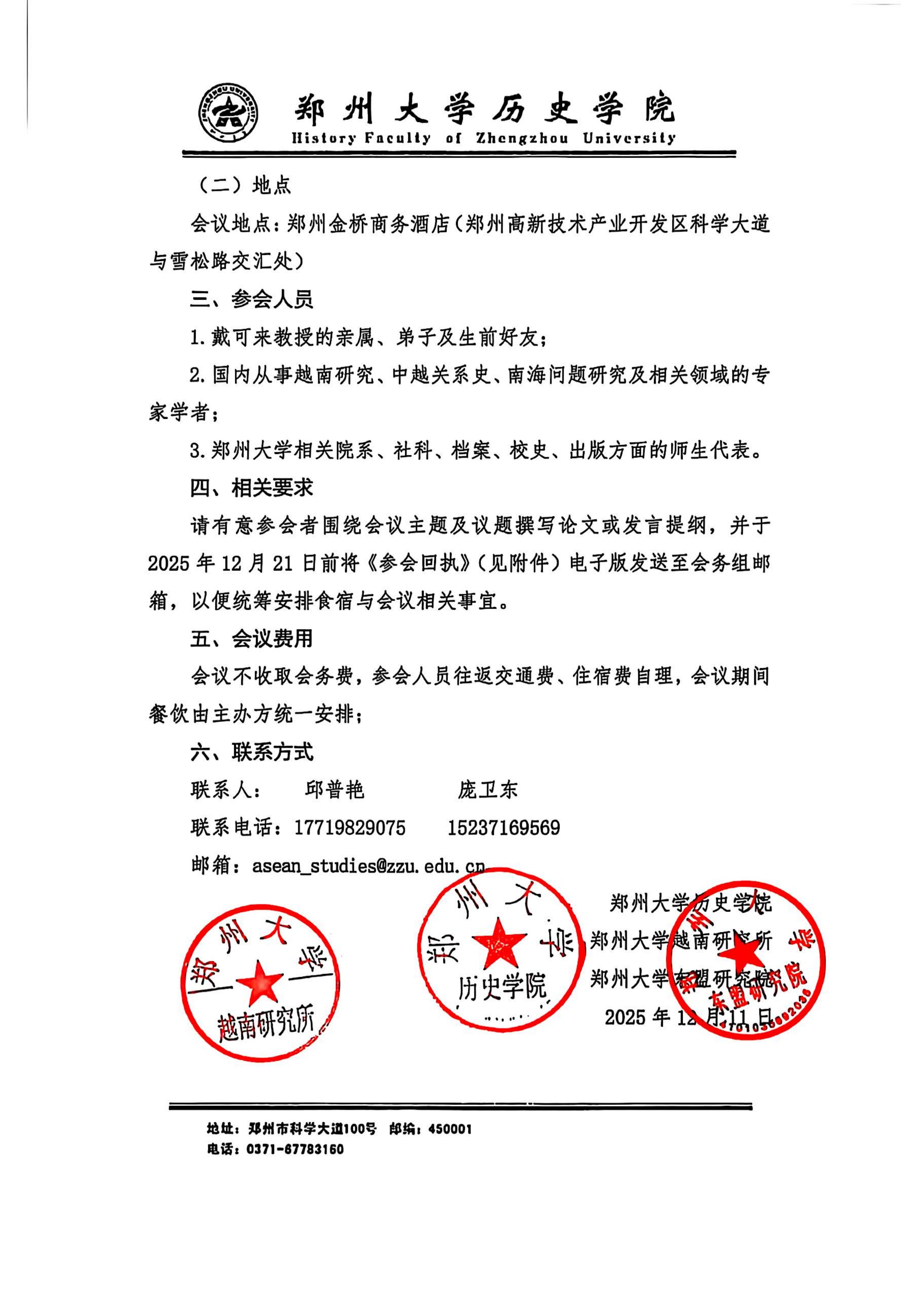 戴可来教授是我国著名的越南和南海问题专家、郑州大学区域国 别研究的开拓者与奠基人,2025年适逢先生诞辰90周年,亦是先生逝 世十周年。为缅怀先生学术生涯,传承其严谨治学精神,弘扬其家国情 怀,推动中国的越南历史、中越关系及南海问题研究的深入发展,郑州 大学历史学院、郑州大学越南研究所、郑州大学东盟研究院拟于2025 年12月28日举办“纪念戴可来教授诞辰90周年暨中国的越南学研讨 会”。现将有关事项通知如下: