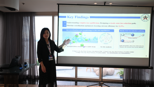 李叶博士作题为“Fluoride-Ion-Regulated Electrolysis of Tantalum Carbon–Oxygen Solid Solutions for Efficient Tantalum Extraction”的报告。报告从钽在电子工业、高端制造及航空航天领域的重要战略价值出发,指出传统电解提钽方法存在阳极不稳定、电化学路径复杂以及钽挥发严重等问题。