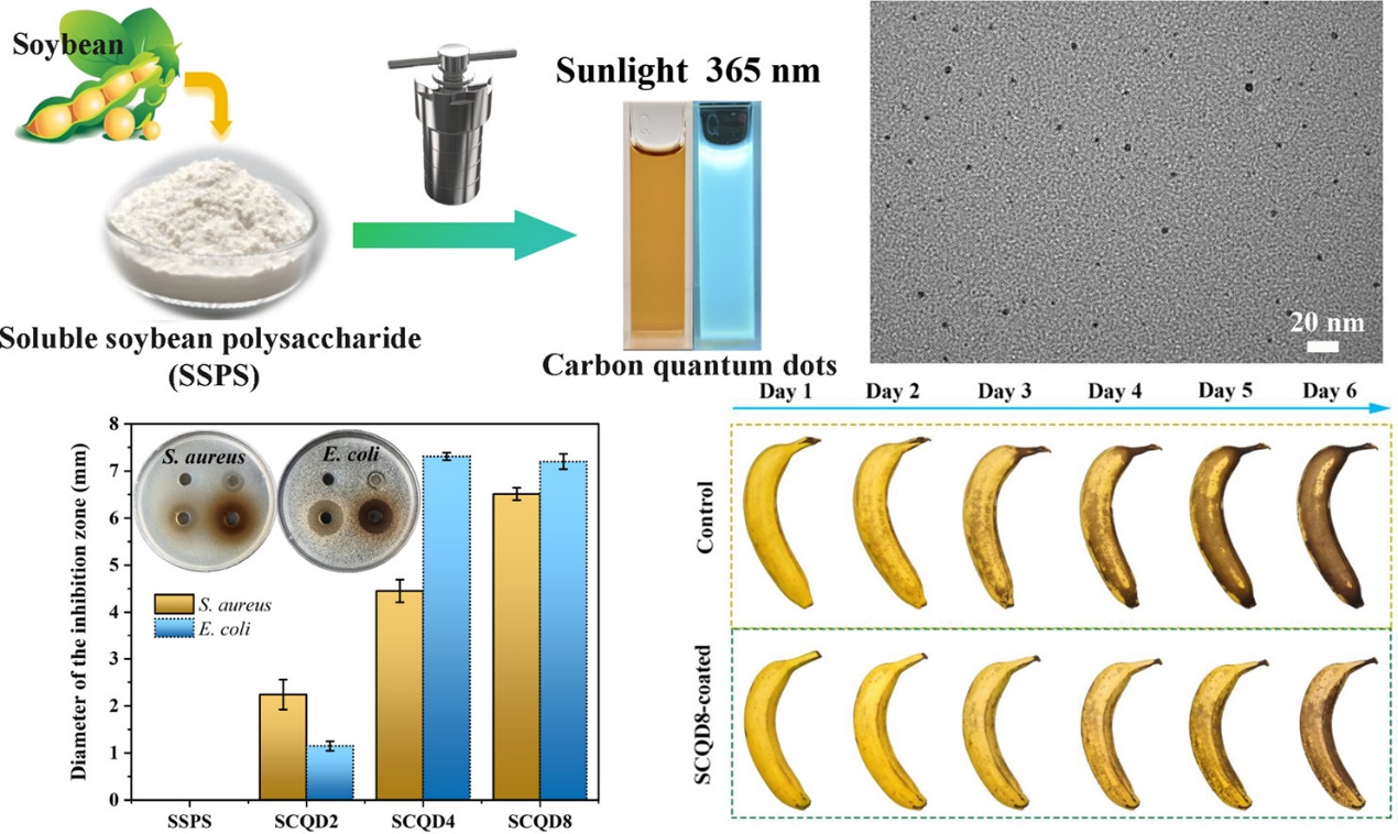 2025年9月,课题组在《International Journal of Biological Macromolecules》上在线发表了学术论文:Green synthesis of carbon quantum dots from soluble soybean polysaccharide for multifunctional applications。本研究采用水热法,以可溶性大豆多糖(SSPS)为碳源制备了碳量子点,所得的可溶性大豆多糖衍生碳量子点(SCQDs)为均匀的纳米颗粒,表现出强烈的蓝色荧光和优异的水分散性,同时具备良好的生物相容性、显著的抗氧化和抗菌性能。该碳点材料已成功应用于细胞成像、金属离子检测以及水果保鲜等领域。该论文以郑州大学为第一单位,2023级硕士生谢怡兰和耿向东博士为论文的共同第一作者,通讯作者为刘捷副教授和汤克勇教授。《International Journal of Biological Macromolecules》为中科院分区二区TOP期刊,最新影响因子为8.5。