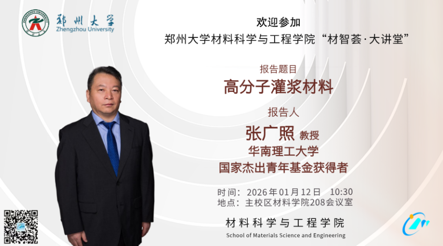 2026年1月12日,华南理工大学张广照教授应邀访问我室,并在郑州大学材料科学与工程学院208会议室作了题为《高分子灌浆材料》的学术报告。