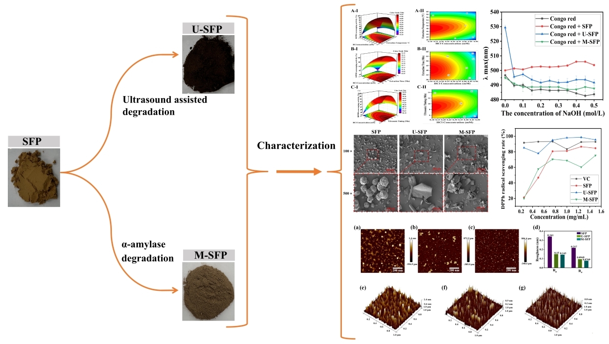 在本研究中,首先从 Sargassum fusiforme 中提取多糖,并采用两种不同的方法进行降解处理:超声辅助盐酸降解(U-SFP)和 α-淀粉酶辅助酶解法(M-SFP)。同时,利用 Box-Behnken 响应面设计(BBRS) 对降解条件进行了优化。研究系统分析了处理前后多糖的结构变化,包括体外消化过程中分子量的变化。结果表明,降解处理显著影响了多糖的关键结构特征,如表面形貌、溶解性、结晶度以及三螺旋结构等。