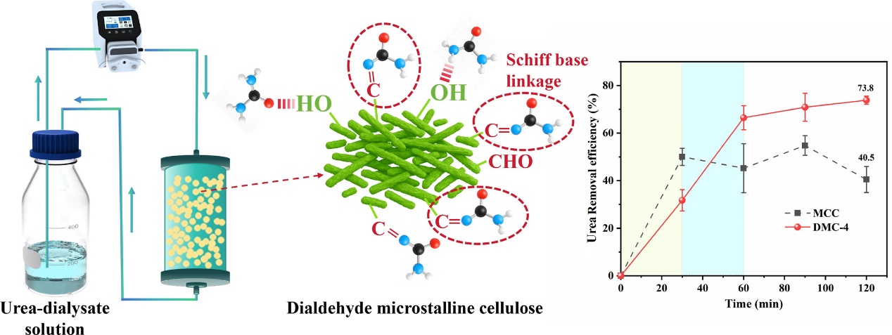 近日,课题组在《International Journal of Biological Macromolecules》上在线发表了学术论文:Efficient urea removal using dialdehyde microcrystalline cellulose for dialysate regeneration in wearable artificial kidneys。该研究采用高碘酸钠氧化微晶纤维素(MCC),成功制备出富含醛基的双醛微晶纤维素(DMC)。通过调控氧化剂比例,获得了醛基含量可调且具有多孔无定形网络结构的DMC。结构表征与吸附动力学分析表明,DMC对尿素分子的去除机制涉及醛基与尿素氨基间的希夫碱共价键合,以及氢键相互作用的协同贡献。在模拟人工肾动态动态循环的固定床柱测试中,DMC在120 min内对尿素的去除效率达73.8 ± 1.7%,显著优于未改性MCC(40.5 ± 5.5%)。该研究提出了一种面向便携式透析设备的尿素高效去除新途径,为可穿戴人工肾系统的核心吸附材料设计提供了新思路。该论文以郑州大学为第一单位,宋仲峰为第一作者(共一第一),通讯作者为刘捷教授和河南省人民医院邵凤民教授。《International Journal of Biological Macromolecules》为中科院分区二区TOP期刊,最新影响因子为8.5。