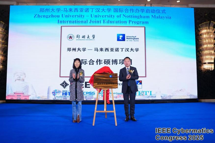10月31日,郑州大学与马来西亚诺丁汉大学国际合作办学项目在郑州JW千玺大宴会厅正式启动。该项目依托2025年IEEE国际人机物智能大会(IEEE Cybermatics Congress 2025)的学术平台,由郑州大学校方代表与马来西亚诺丁汉大学校方代表共同揭牌启动。