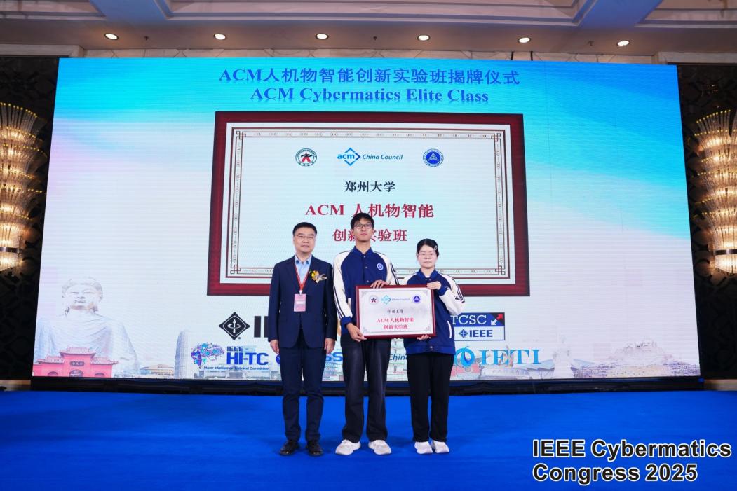 郑州大学计算机与人工智能学院宋伟副院长与学生代表李文俊和刘琪琪共同进行ACM人机物智能创新实验班揭牌仪式。