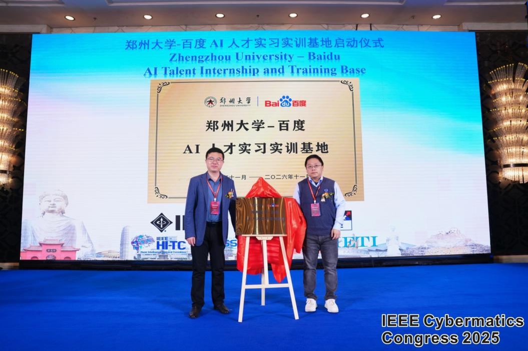 大会上举行了郑州大学与多方合作的揭牌仪式。首先,郑州大学计算机与人工智能学院国际交流办公室主任王咏梅与马来西亚诺丁汉大学教授段德君为“郑州大学-马来西亚诺丁汉大学国际合作办学”共同揭牌。随后,郑州大学计算机与人工智能学院副院长娄铮铮和百度高校合作总监李轩涯为“郑州大学-百度AI人才实习实训基地”共同揭牌。