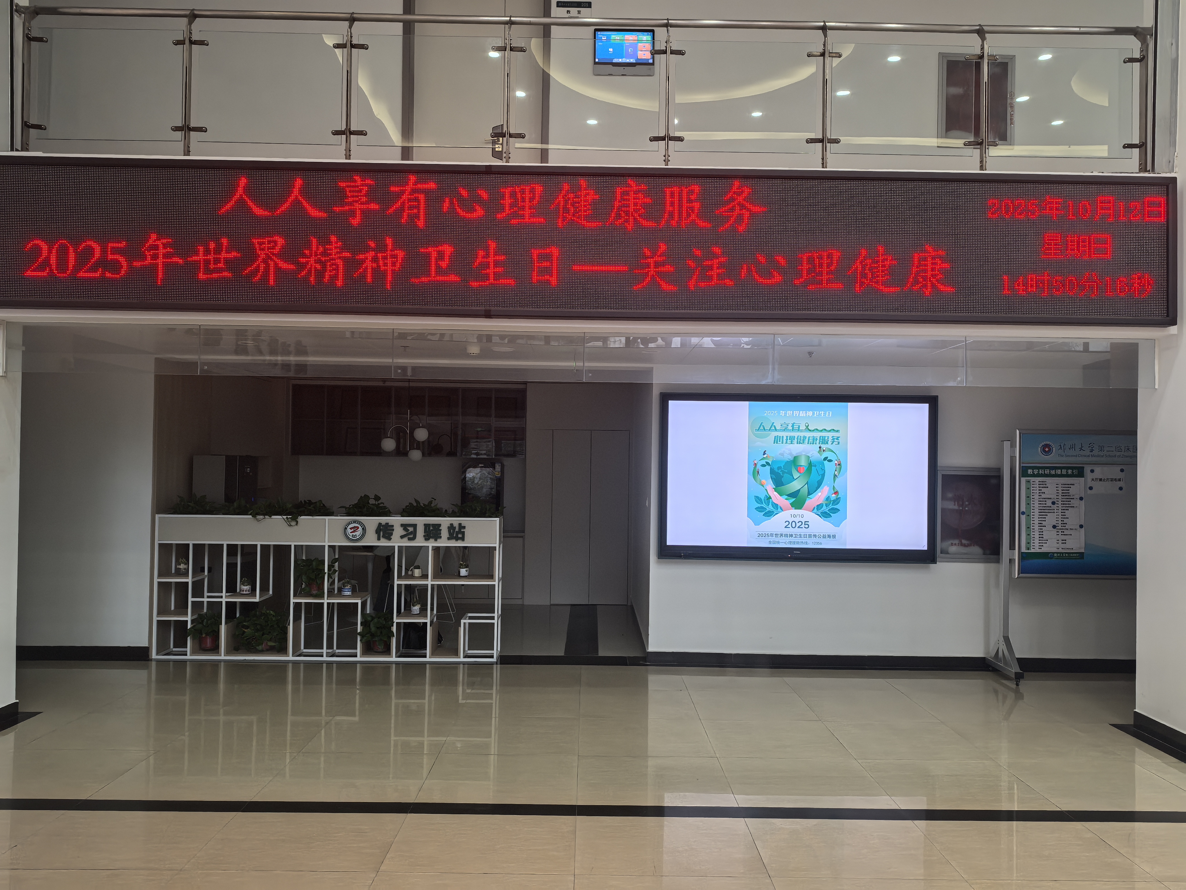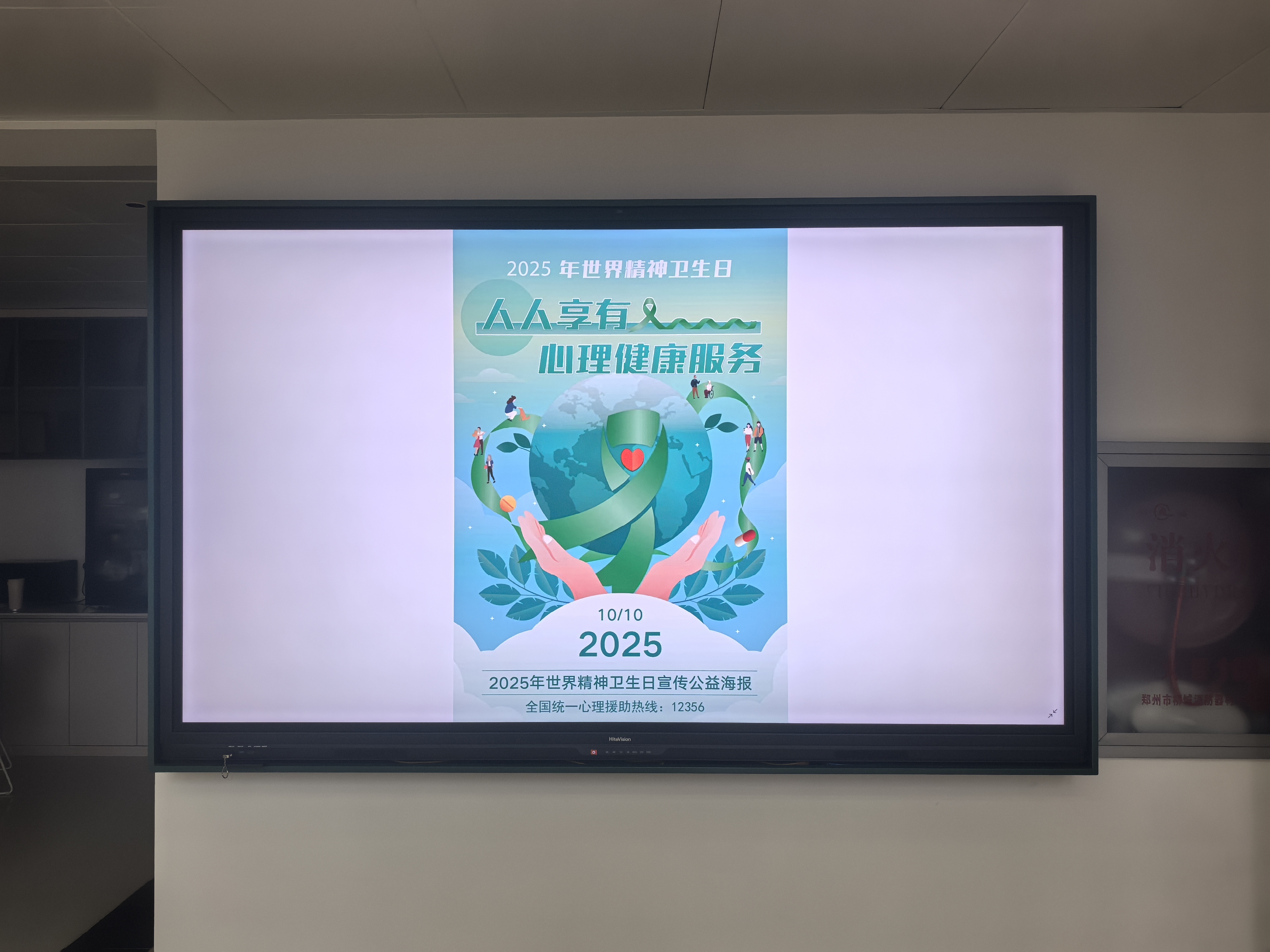 为让心理健康知识融入师生日常,学院提前部署、统筹推进宣传氛围营造工作。在教学科研楼大厅电子屏循环播放世界精神卫生日主题标语、心理健康科普短片,走廊展板上张贴涵盖“常见心理问题识别方法”“情绪调节小技巧”“精神卫生求助渠道”等内容的宣传海报,让师生在上下班、上下课途中就能轻松接触心理健康知识,潜移默化中提升对精神卫生工作的认知,为后续系列活动开展奠定了良好舆论基础。