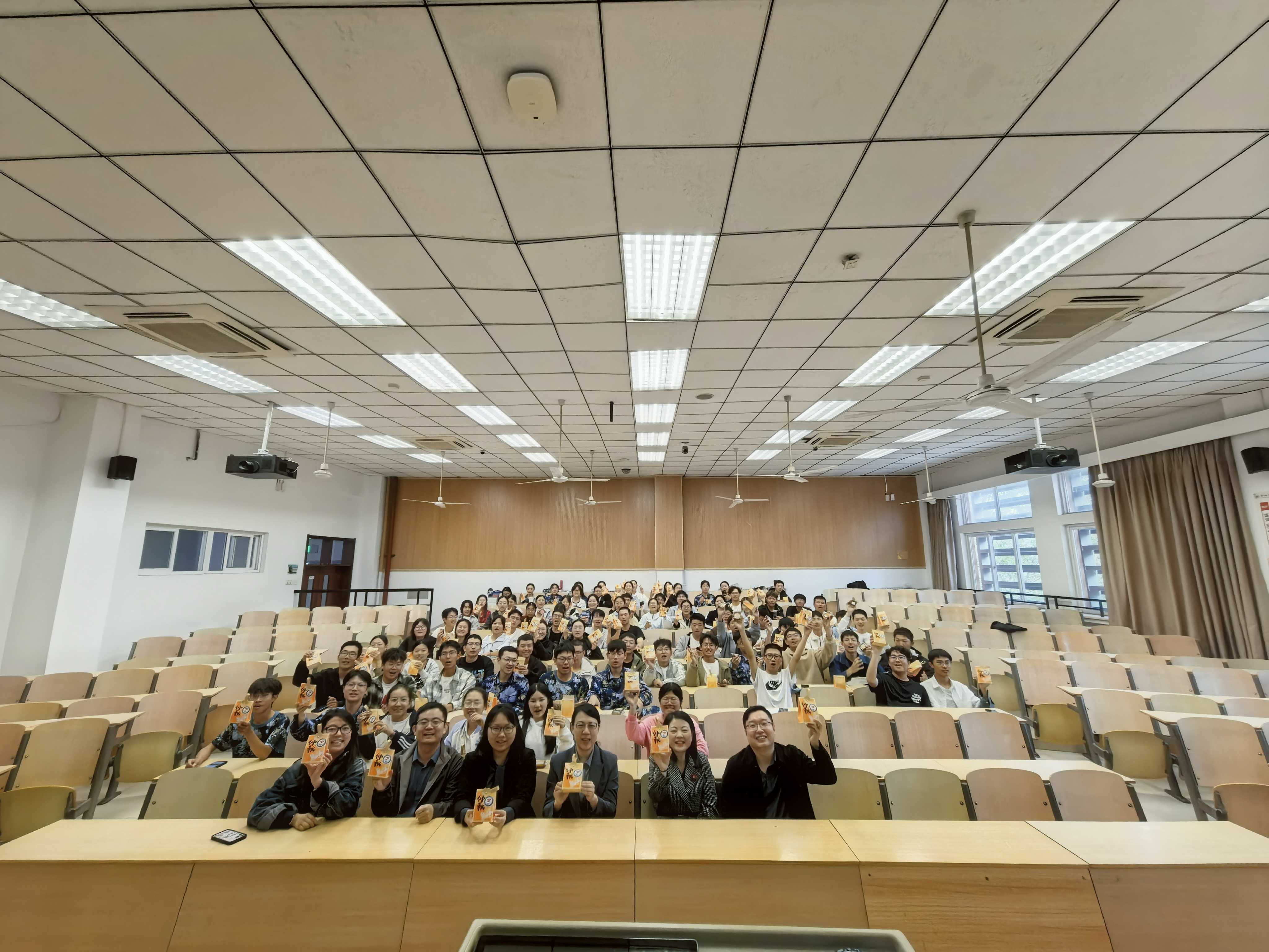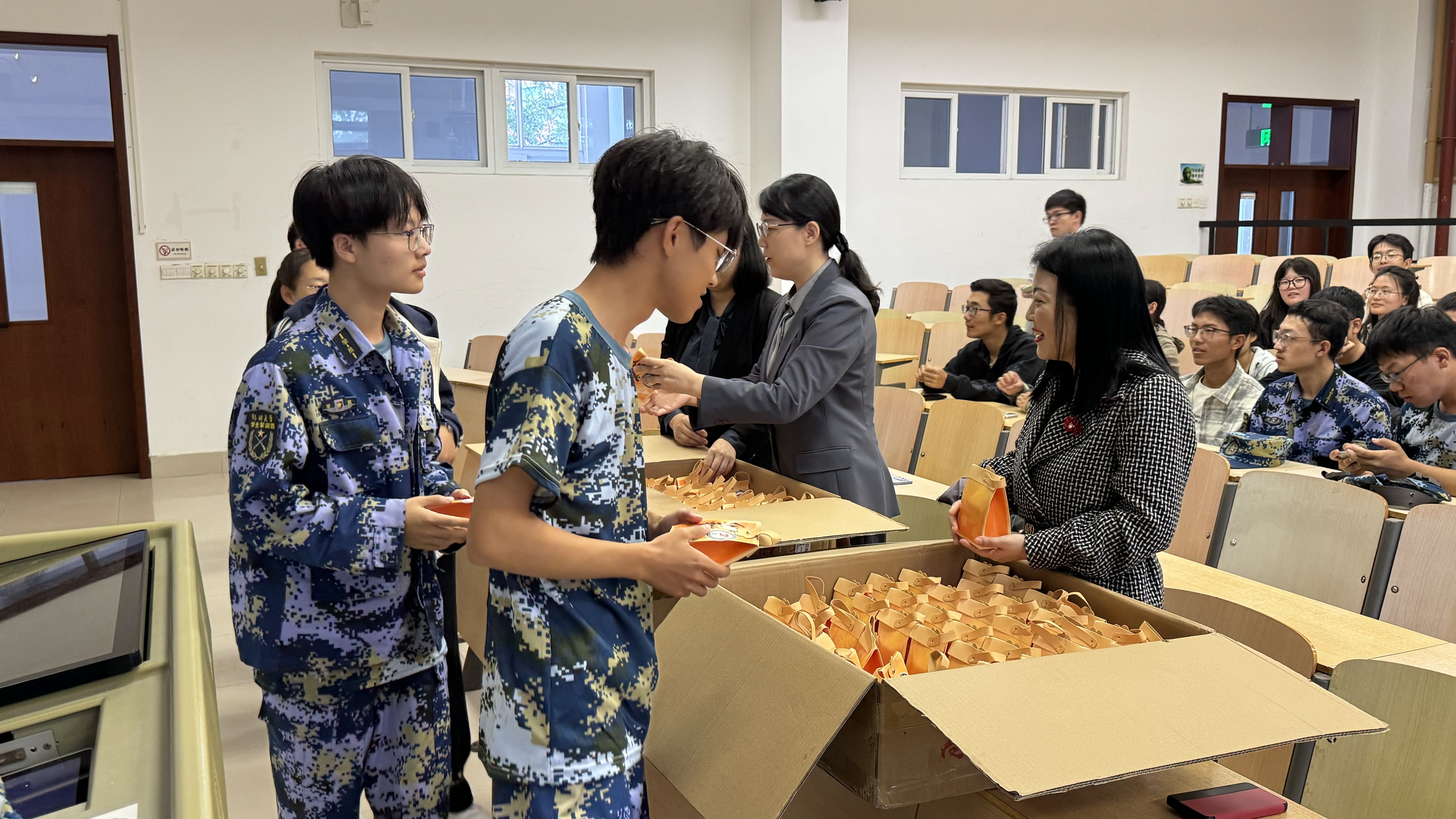 “从高中到大学,不仅是学习环境的转变,更是心理状态、角色定位的重塑。”李晏院长以“调整心态—迎接丰富多彩的大学生活”为主题,为新生讲授了“入学第一课”。她细致讲解了“怎样应对学业压力与人际关系挑战”等新生关切的问题,并鼓励同学们主动沟通、积极求助,以阳光心态开启大学生涯。讲座结束后,李晏院长与魏巍副院长亲手为每位新生分发专门定制的“传习”月饼,一句句“注意身体”“有困难随时找老师”的叮嘱,让远离家乡的新生们在军训的疲惫中感受到了“家”的温暖,不少新生表示:“学院的关怀让我们心里暖暖的,也更有信心适应大学生活了。”