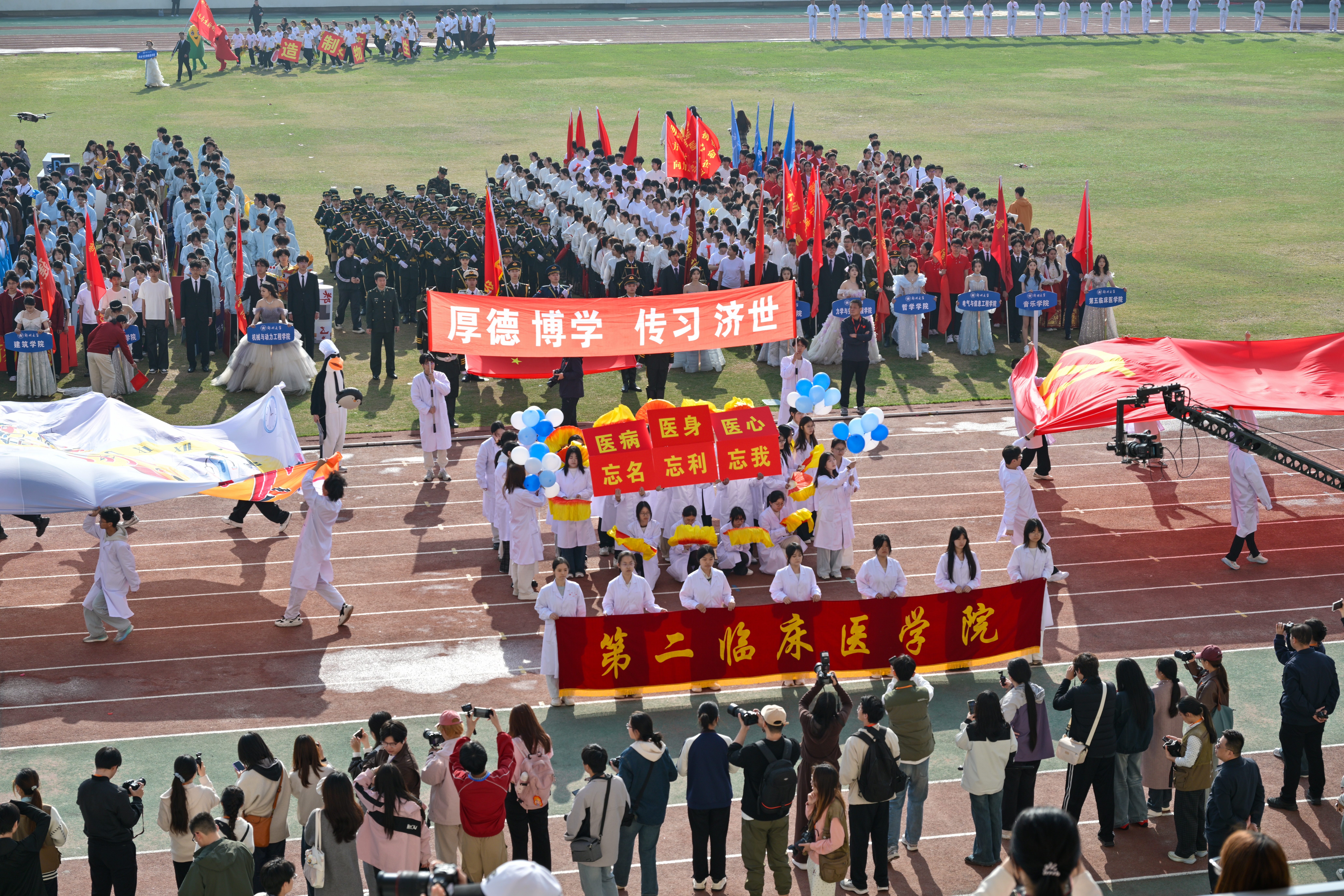 春日的运动场彩旗猎猎,鼓乐铿锵,处处洋溢着青春的活力与激情。在热烈的掌声中,第二附属医院、第二临床医学院师生方阵以昂扬的精神状态,迈着坚定的步伐入场。在主席台前,师生方阵手持“厚德博学,传习济世”的院训标语牌,整齐划一地变换着队列行进。院旗如春风拂过,党旗在阳光下熠熠生辉、自人群中粲然升起,这是第二临床医学院学子以热血织就的忠诚答卷,更是医心向党的医学誓言。