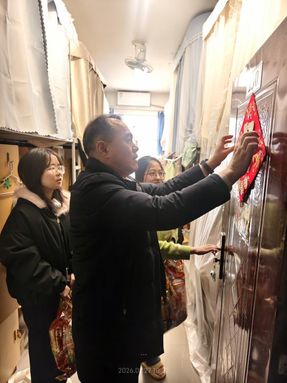 院领导一行深入宿舍,与同学们亲切交流,细致询问大家的留校原因、假期安排与生活需求,为留校学生发放零食大礼包,并为宿舍张贴“福”字,送出学院的暖心祝福。期间,领导们叮嘱暂时留校的学生注意消防及人身财产安全等,保持通讯畅通,有困难及时联系老师。对于已全部离校的学生宿舍,老师们仔细检查宿舍是否断电、锁好窗户等,并为宿舍贴上粉色封条。点滴细节,让远离家乡的学子真切感受到“家”的温暖。