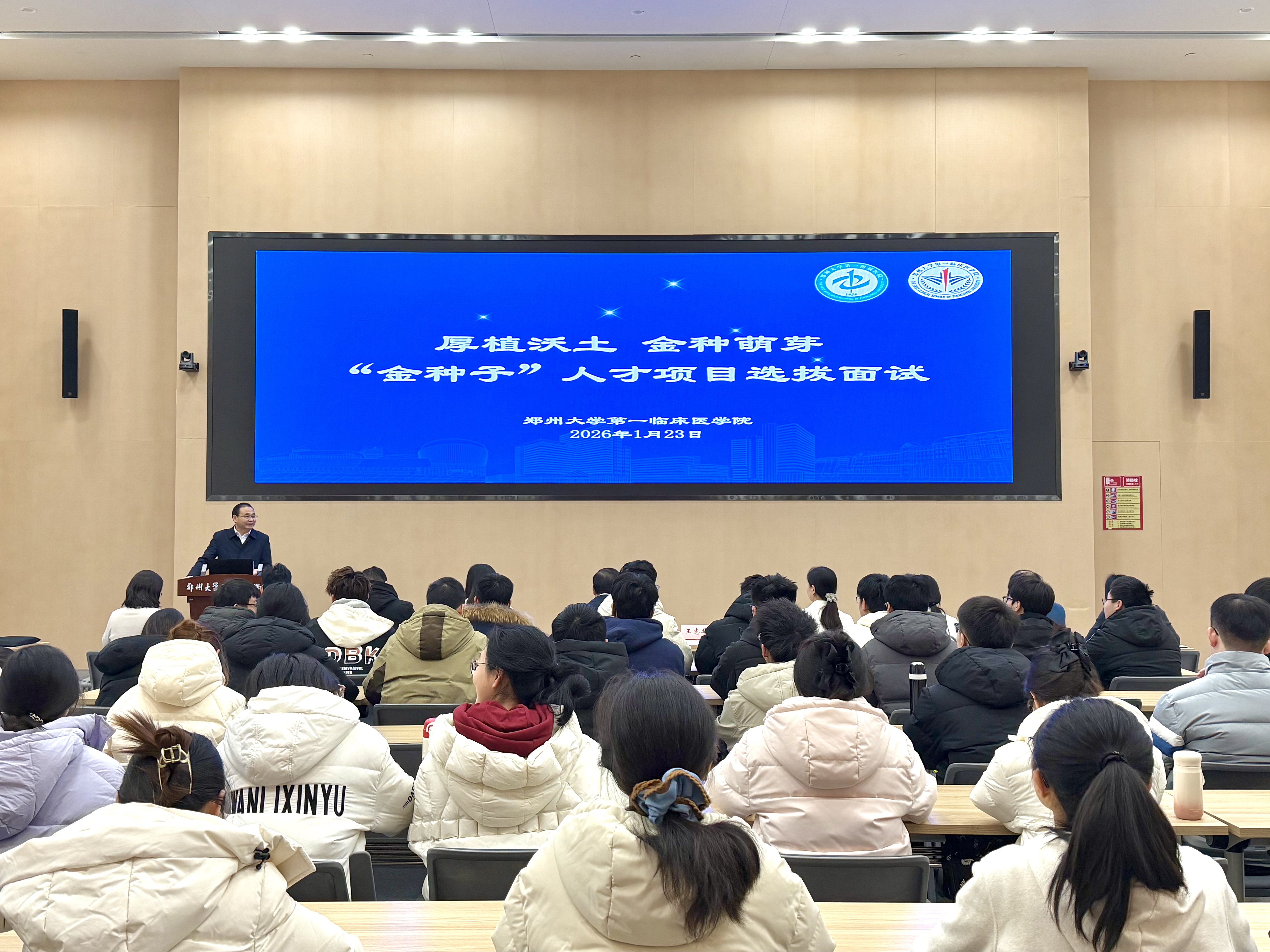 1月23日,郑州大学第一临床医学院第四期“金种子”人才培养项目面试选拔会在河医院区科教楼会议中心成功举行。学院执行院长高剑波、副院长王志举、研究生办公室主任张会芹、临床医学5+3管理办公室主任贾玲玉出席选拔会。唐俊楠、张旭东、边志磊、宋学勤、张永高、崔光莹六位教授受邀担任评审专家,对来自2022级临床医学(5+3一体化)专业的23名优秀候选人进行综合选拔。2025级临床医学(5+3一体化沈琼班)专业学生到场进行观摩学习。本次选拔工作由王志举主持。