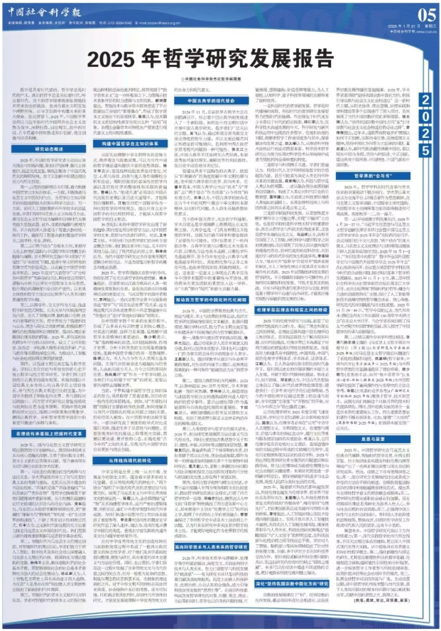哲学是具有时代感的,哲学家总是时代的产儿。真正的哲学总是关切着时代,呼应着时代。当下的哲学探索既面临智能技术带来的全新挑战,也肩负着在文明互鉴中阐释传统、在守正创新中构建未来的重大使命。在此背景下,2025年,中国哲学界坚持以习近平新时代中国特色社会主义思想为指导,深耕经典,回应现实,在中西对话、古今贯通中持续推进知识创新、理论创造与话语构建。