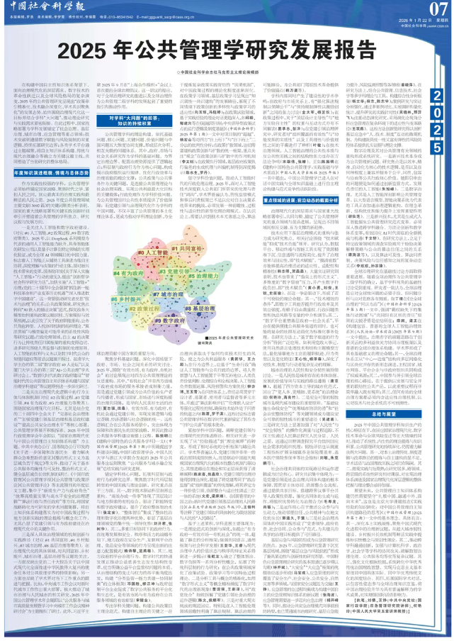 在构建中国自主的知识体系背景下,面向治理现代化的深层需求、数字技术的革命性跃迁以及全球风险格局的复杂演变,2025年的公共管理研究呈现出“政策牵引精准化、技术融合深度化、学术共识聚焦化”的发展态势,始终围绕治理现代化这一目标并结合学科“大问题”,推动理论研究与实践需求紧密衔接。在此过程中,国家战略部署为学科发展锚定了社会治理、基层治理、城市治理、应急管理等重点领域;技术突破则遵循数字赋能与风险规制的双重逻辑,持续拓展研究边界;各类学术平台通过主题凝聚,将自主知识体系构建、传统与现代治理融合等确立为关键议题主线,共同塑造了当前研究的整体格局。