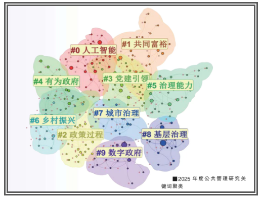 作为实践性较强的学科,公共管理学必须始终锚定国家战略、聚焦时代之学、紧扣人民之问,回应最真实的治理实践和最鲜活的人民之需。2025年度公共管理领域主要文献(3092篇)的关键词聚类分析表明,国家的重大战略部署和关键实践创新时刻牵引并塑造着公共管理的学科焦点、研究议程与发展方向。