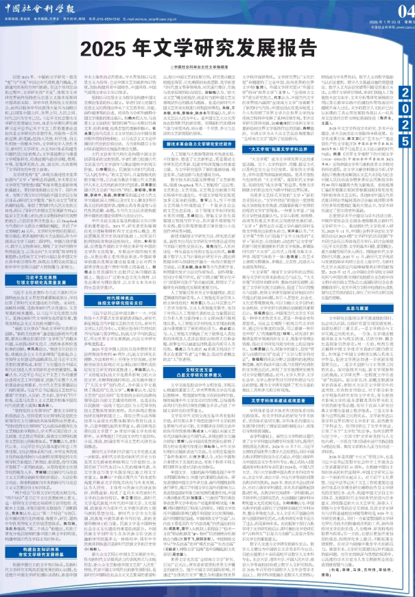 2026年是我国“十五五”开局之年,也是习近平总书记在哲学社会科学工作座谈会上发表重要讲话10周年。在构建中国自主知识体系的时代征程中,中国文学研究正站在一个新的历史起点上。对习近平文化思想、习近平总书记关于文艺工作的重要论述进行体系化学理化研究阐释始终是文学研究的首要任务,此外,构建中国文学自主知识体系、发掘新时代文学的时代价值与历史意义、持续推进新大众文艺研究、探索人工智能与文学等前沿交叉领域、反思文学史研究与学科基础理论问题等都将是2026年文学研究的重点。我们一方面要警惕将文学研究异化为技术的附庸或功利的工具,始终保持对文学经世价值、人文精神、审美特性的敬畏与探索;另一方面,也要以更加开放包容的姿态,持续深化本土意识,不断拓展全球视野,在对话与碰撞中激发学术创新活力。展望未来,文学研究需要回应时代提出的新问题,在历史的纵深与思想的探索中,以高度的学术自觉为人类文明新形态的创造贡献智慧与力量。