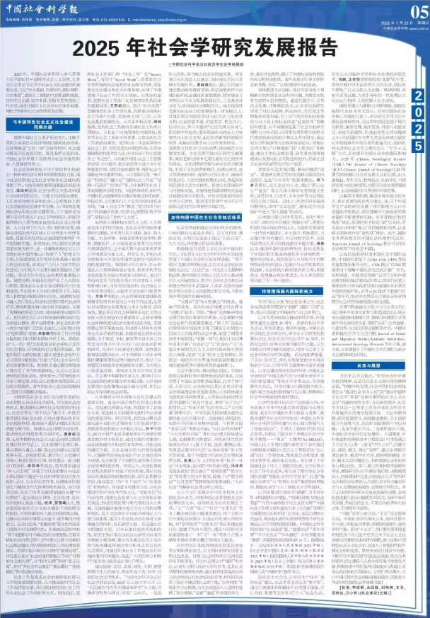 2025年,中国社会学界深入学习贯彻习近平新时代中国特色社会主义思想,尤其是习近平总书记关于社会主义社会建设的重要论述,立足“学术基础、实践导向、国际视野、历史维度”,直面人工智能时代的机遇和挑战,坚持先立后破、稳中求进,在服务党和国家工作大局、推进中国自主社会学知识体系构建、增强学科影响力方面取得显著进展。