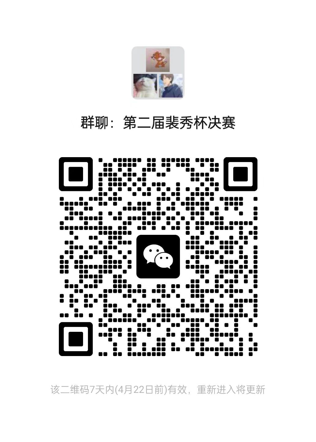 请入围决赛的选手高度重视备赛工作,可以对参赛作品进行一定程度的增补修改。关于决赛的地点、流程及相关注意事项,将统一在决赛专属工作群内发布,请入围作品的队长(项目负责人)务必及时扫描下方二维码加入群聊,进群后请规范修改备注为“姓名+参赛序号”。逾期未加入群聊且未与主办方联系确认的,视为自动放弃决赛资格。