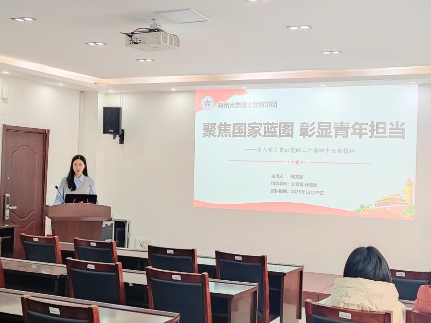 为深入学习贯彻党的二十届四中全会精神,引导同学们自觉将个人发展融入国家事业大局,12月29日上午,学院邀请郑州大学博士生宣讲团讲师杨文静来院开展专题宣讲。本次宣讲以“聚焦国家蓝图,彰显青年担当”为主题,学院研究生党员、入党积极分子认真聆听宣讲,深入学习领悟全会精神。