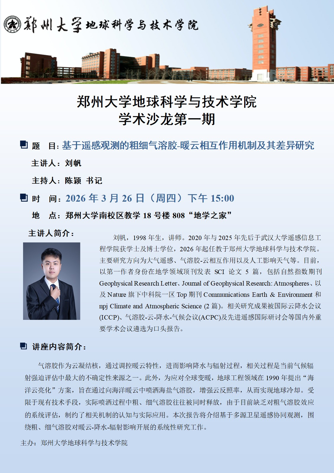 刘帆,1998年生,讲师。2020年与2025年先后于武汉大学遥感信息工程学院获学士及博士学位,2026年起任教于郑州大学地球科学与技术学院。主要研究方向为大气遥感、气溶胶-云相互作用以及人工影响天气等。目前,以第一作者身份在地学领域顶刊发表SCI 论文5 篇,包括自然指数期刊Geophysical Research Letter, Joumal of Geophysical Research: Atmospheres, D及Nature 旗下中科院一区Top 期刊 Communications Earth & Environment 和npj Climate and Atmospheric Science (2篇)。相关研究成果被国际云降水会议(ICCP)、气溶胶-云-降水-气候会议(ACPC)及先进遥感国际研讨会等国内外重要学术会议遴选为口头报告。