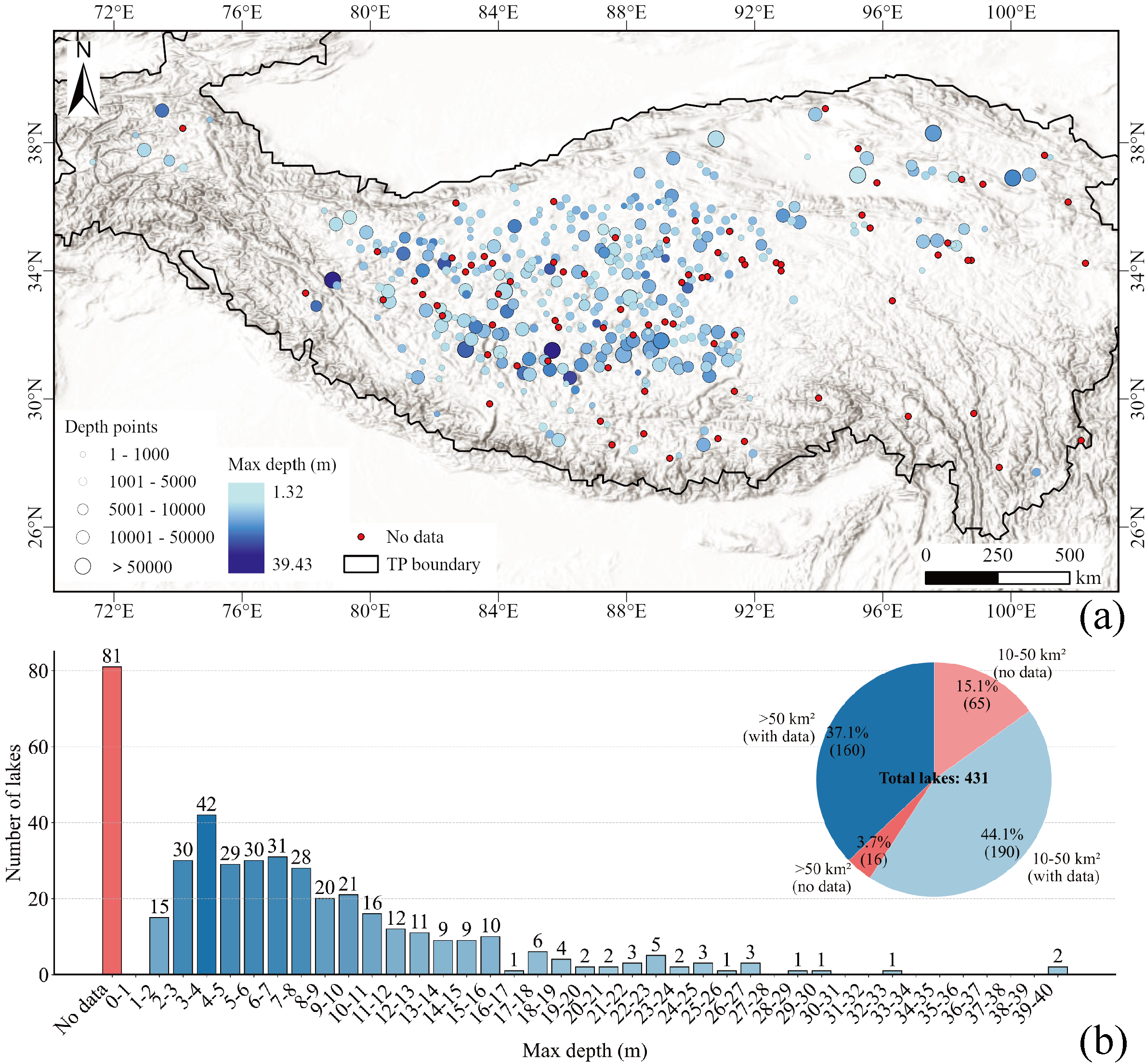 图1 青藏高原基于ICESat-2的湖泊水深提取空间分布及统计特征:(a)各湖泊的最大水深及水深点数量;(b)各湖泊最大重建水深的分布情况