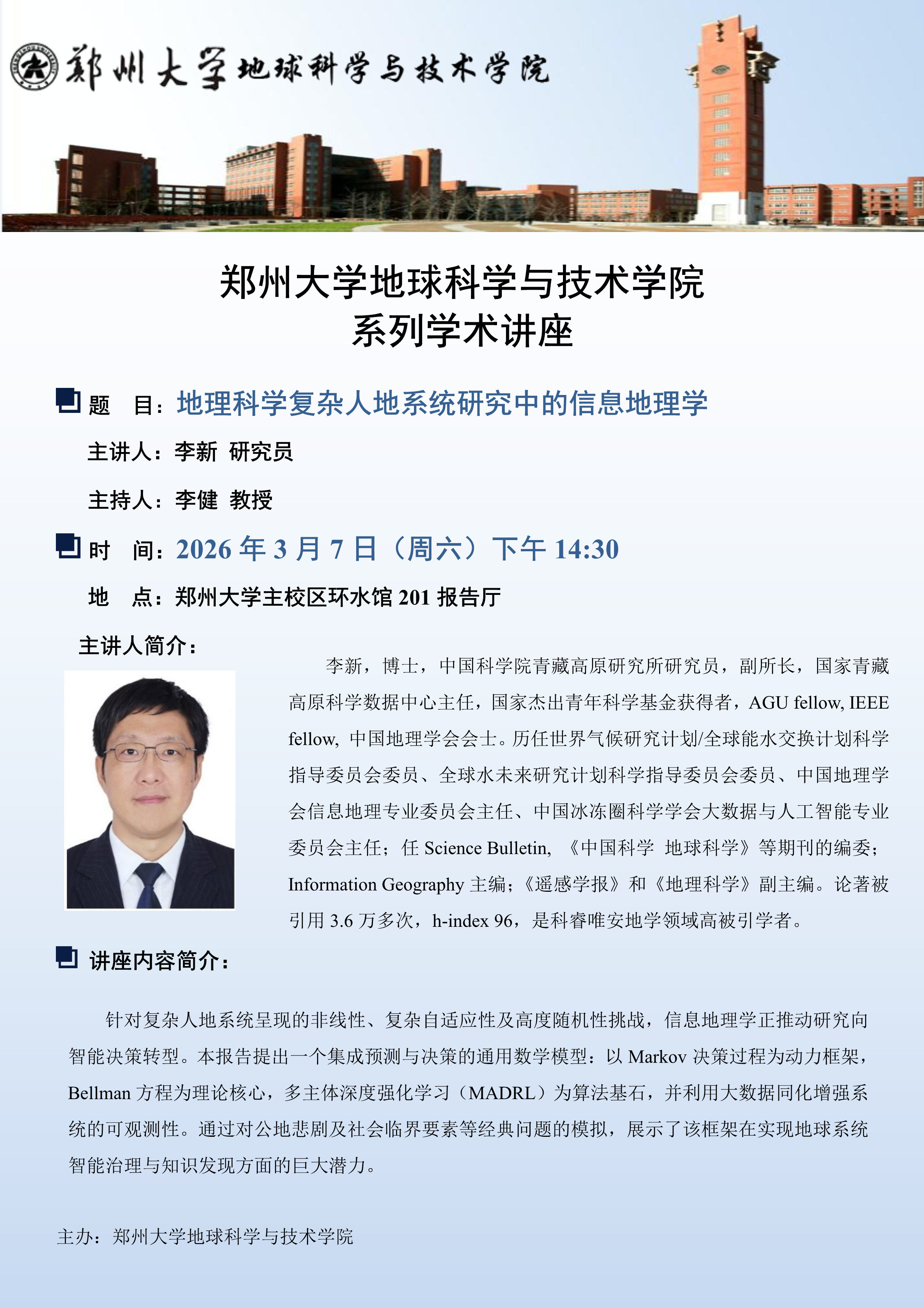 地球科学与技术学院邀请中国科学院青藏高原研究所李新研究员做学术报告