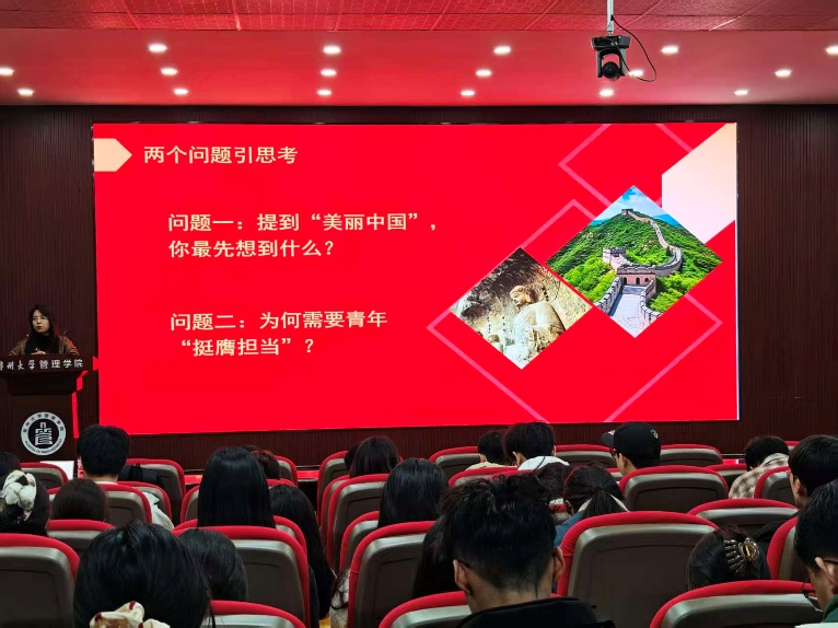 11月12日晚,学生工作办公室高级主管郭安宁老师以“新时代青年要在美丽中国建设中挺膺担当”为主题展开第二讲。郭老师以两个问题——“提到‘美丽中国’,你最先想到什么?”和“为何需要青年‘挺膺担当’”,引发同学们的深入思考。她强调,“国之大者”从不是口号,而是青年将个人选择锚定国家需求的自觉,从“旁观者”到“主力军”的定位转变。她围绕“挺膺担当的四维路径”,指出青年应勇于行动,在实践中为国家发展贡献青春力量,为中国式现代化挺膺担当,奋力书写无愧于时代的青春篇章。