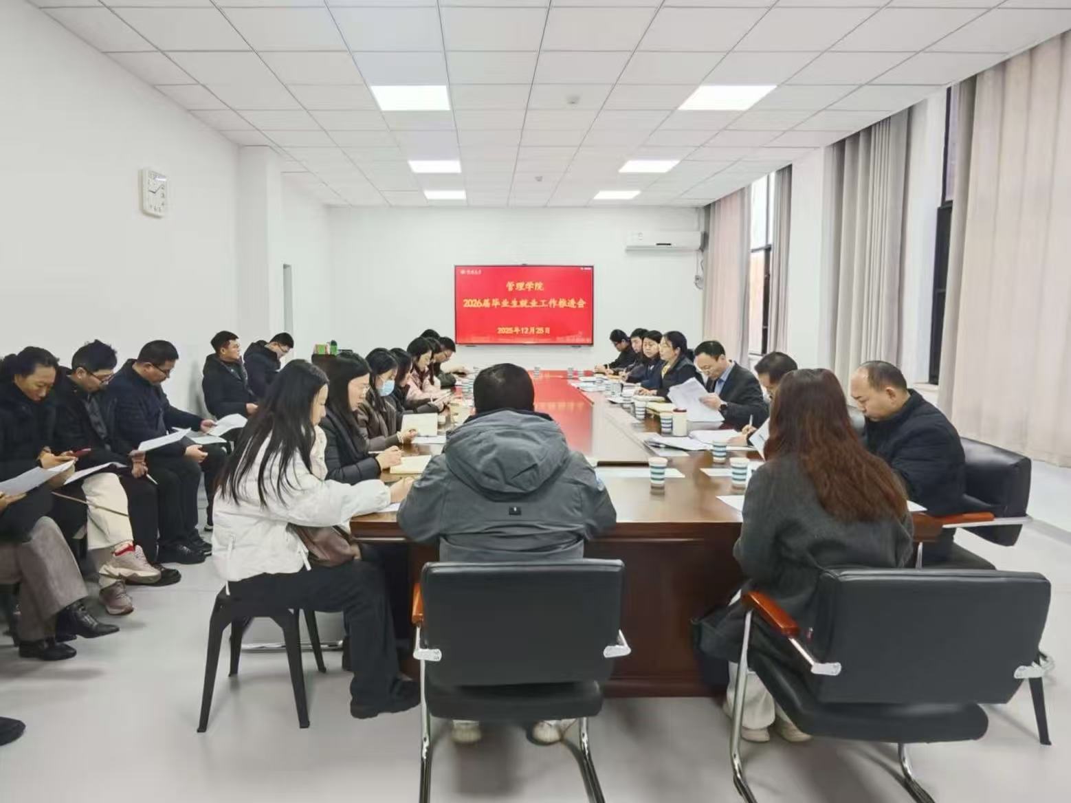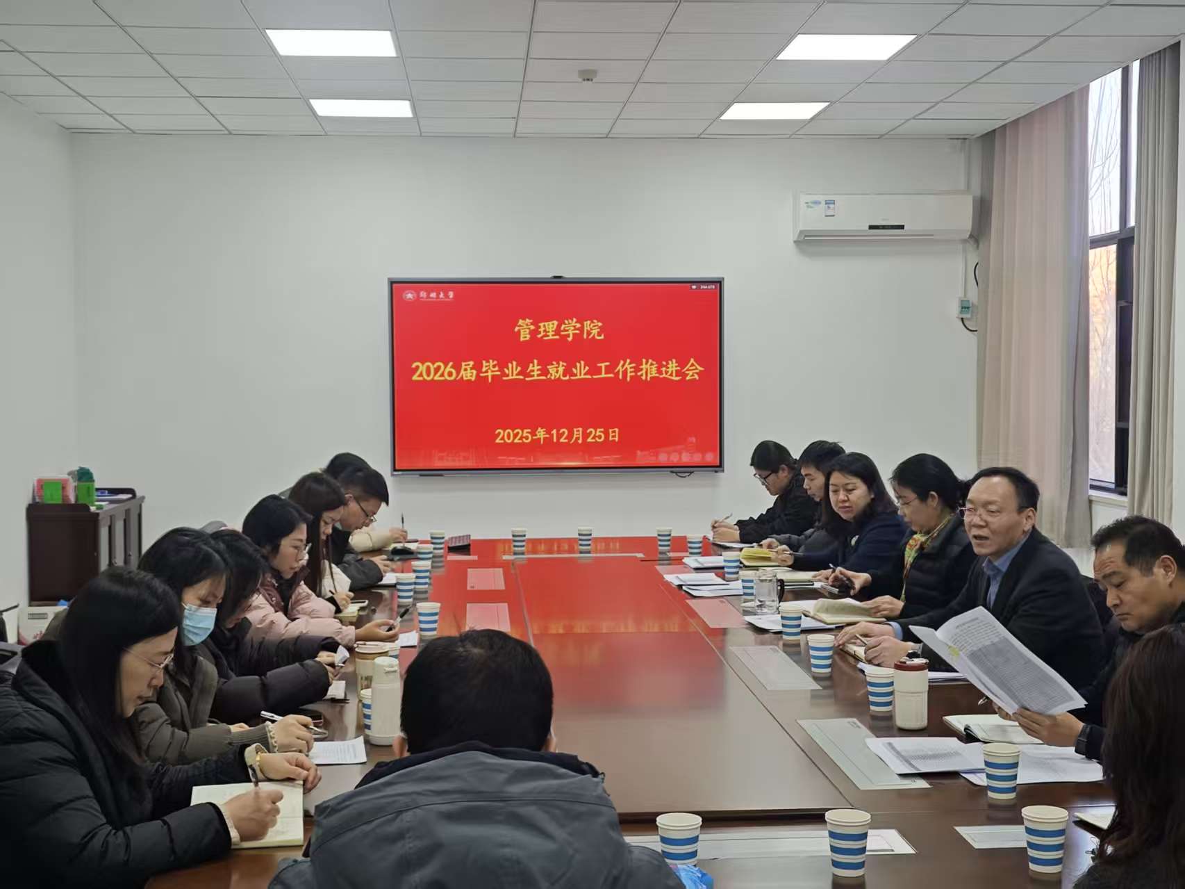 12月25日上午,管理学院召开2026届毕业生就业工作推进会。学院党委书记王淑英、院长井辉、院党委副书记范媛媛、副院长朱美光、副院长姜红丙出席会议,各系所负责人、毕业年级辅导员和班主任共同参会。会议由学院党委书记王淑英主持。