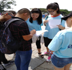 实践团队来到泰山景区,向景区里的游客们发放关于泰山服务业满意度的问卷。这时的队员们褪去了景区实地走访时的羞涩,更加从容淡定地与游客们交流。