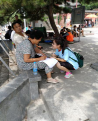 为了更深入地了解游客们对于泰山景区服务业的看法,在游客们填写问卷时,队员们同时与游客们交流,询问游客们对于泰山景区服务改进的建议,做进一步的思考。