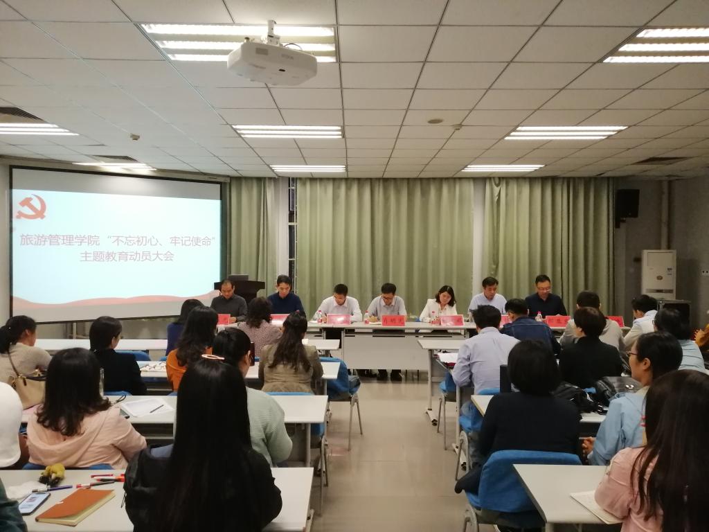 9月19日下午,旅游管理学院在一楼导播厅组织召开“不忘初心、牢记使命”主题教育动员大会,学校第三巡回指导组组长肖明宪,成员刘素娟、赵强,学院领导班子岳林强、李金铠、郎亚东、朱美光,全体教师党员及学生党支部委员共60余人参会,大会由院长李金铠主持。