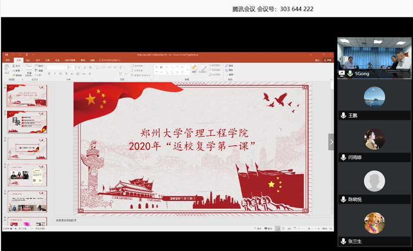 2020年5月9日,在郑州大学管理学院的会议室里时而传出朗朗发言、盈盈笑声,时而响起热烈讨论、振奋歌声,学院党委书记苗惠卿、院长朱永明正带领主管研究生工作的副书记贾兰平、副院长李玉民及团委书记、研究生辅导员徐柳,通过视频会议连线管理工程学院首批返校的4位研究生兼职辅导员,开展着一堂生动的“返校复学第一课”活动。