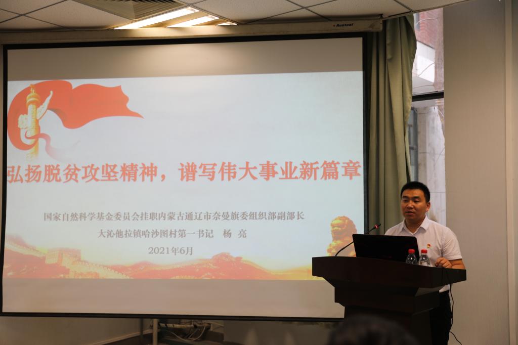 为深入学习贯彻习近平总书记在党史学习教育动员大会上的重要讲话精神,扎实开展学院党史学习教育工作,引导广大师生学党史、悟思想、办实事、开新局,2021年6月3日,我院邀请全国脱贫攻坚先进个人、国家自然科学基金委员会挂职内蒙古通辽市奈曼旗委组织部副部长、大沁他拉镇哈沙图村第一书记杨亮在学院一楼导播厅作专题报告,会议由学院党委副书记郎亚东主持,学院50余名师生参加了本次报告会。