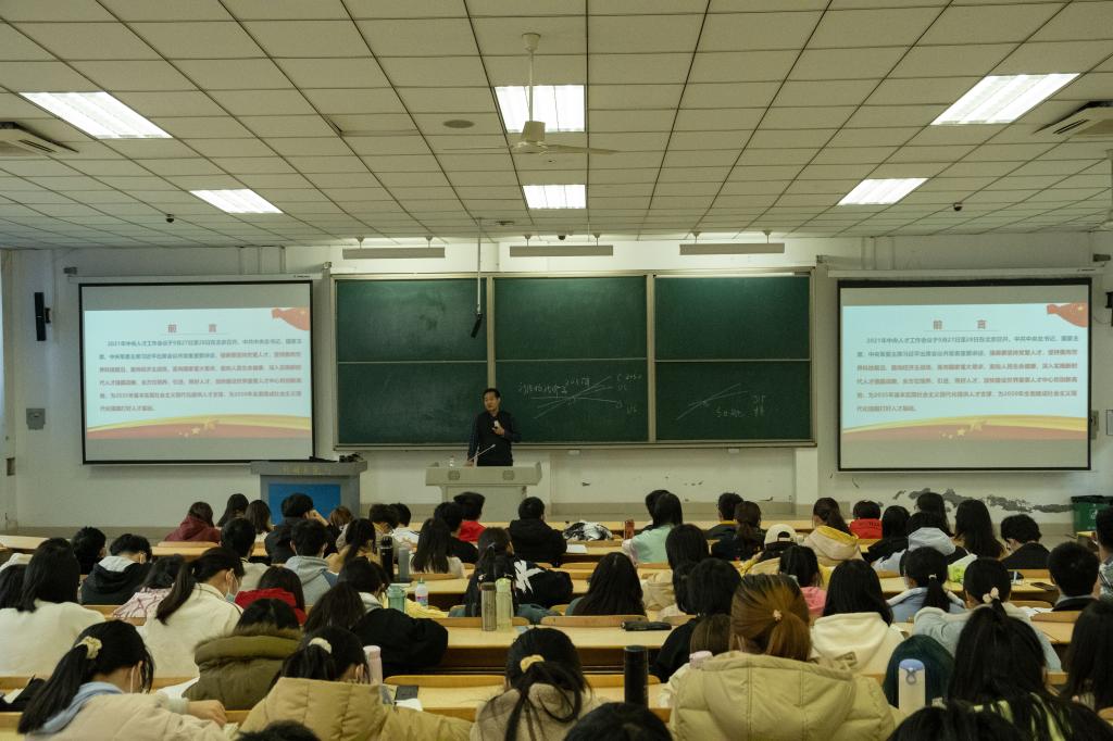 为了深化党的性质与指导思想,全面深入贯彻落实十九届六中全会精神,11月27日上午10:00,旅游管理学院副院长朱美光以《全面深入贯彻落实十九届六中全会精神,贯彻学习2021年在中央人才工作会议上重要讲话精神》为主题,为学生开展了一堂别开生面的思想政治理论课,我院2021级学生参加活动。