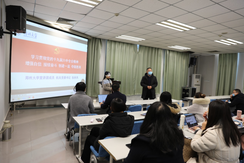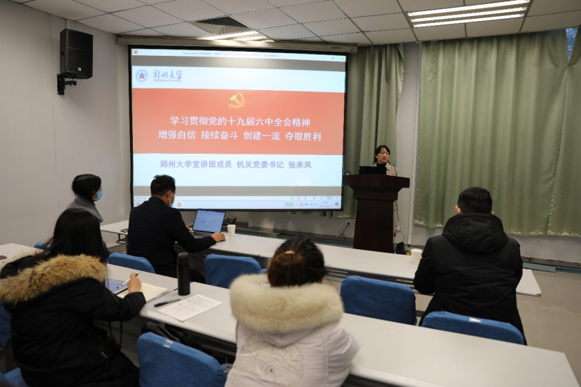 张承凤围绕着党的十九届六中全会召开的背景和重大意义、决议的主要内容和创新成就以及贯彻党的十九届六中全会精神落实到实际行动上三个方面展开论述。从《决议》的基本框架,逻辑结构、党百年“四个历史时期”、马克思主义中国化“三次飞跃”、中国特色社会主义新时代我国发展新的历史方向、“3个重大课题”、“十个明确”、“五大历史意义,历史性贡献”、“十条历史经验(十个坚持)”以及“两个确立”等方面对《决议》内容进行了详细的梳理介绍。张承凤强调一切伟大的成就都是接续奋斗的结果,一切伟大的事业都需要在继往开来中推进。今天,实现中华民族伟大复兴进入了不可逆转的历史进程,郑州大学世界一流大学的建设也进入了新的发展轨道。我们要深入学习贯彻落实党的十九届六中全会精神,以史为鉴、开创未来、苦干、勇毅前行,为建设中国特色、世界一流的大学做出新的更大贡献!为实现第二个百年斗目标和中华民族伟大复兴而不懈奋斗!