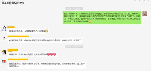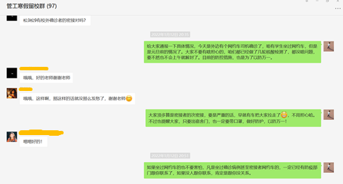 进入学校封控区的一个多星期里,李俊杰老师每天吃住在办公室,一张简易的折叠床就成为了他的休息空间。为了方便管理,李俊杰老师第一时间建立了“管工寒假留校群”,及时地在群里向学生们通报最新情况,不断地为学生们加油打气,及时帮助学生们调整他们的波动情绪。