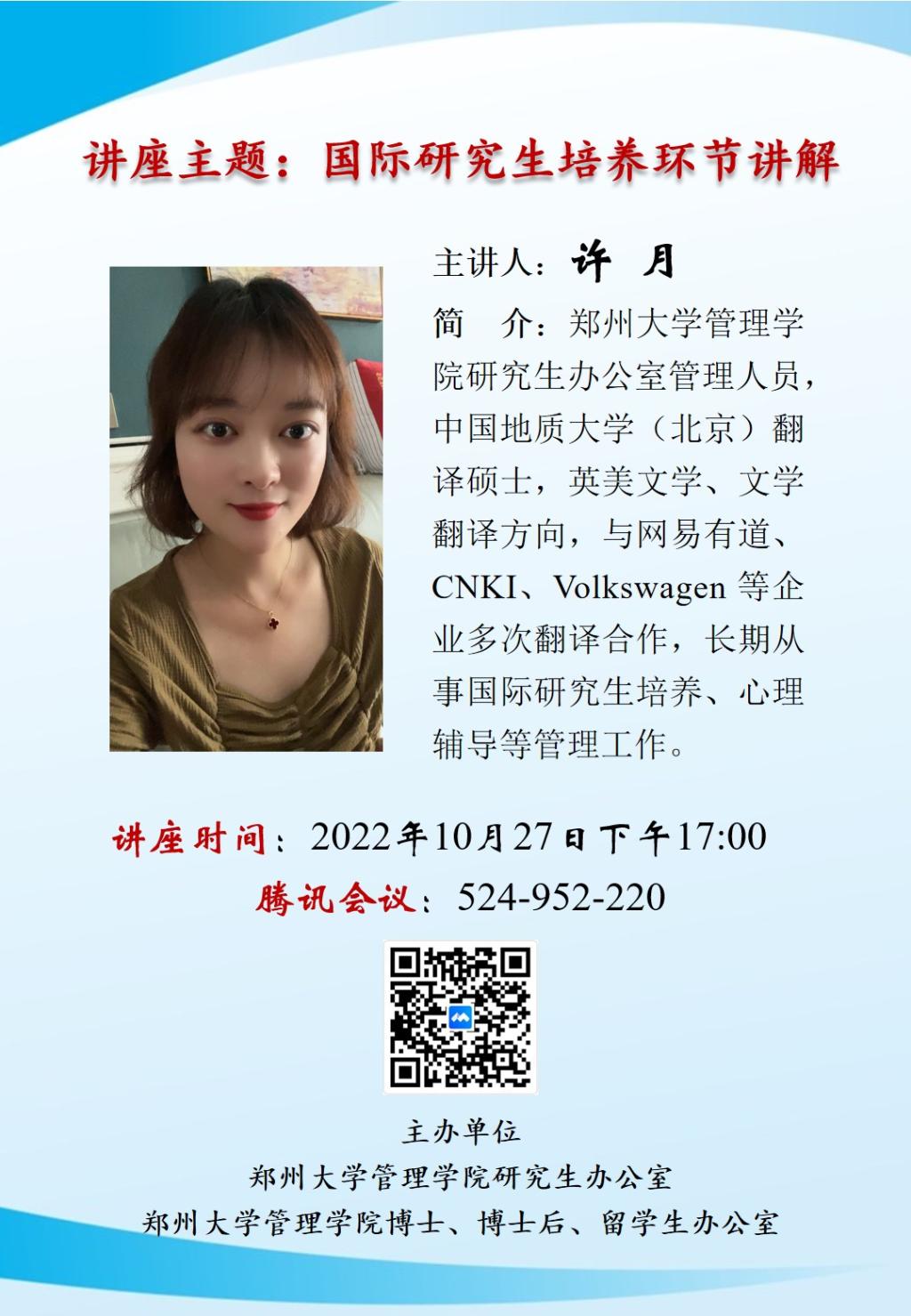 2022年10月27日17:00,管理学院研究生办公室和管理学院博士、博士后、留学生办公室共同组织学院全体国际硕士生、博士生开展了一期题为“国际研究生培养环节讲解”的线上讲座,讲座持续了3个多小时,共有50多位国际研究生和导师参加。此次讲座由学院研究生主管领导李玉民院长统筹,由管理学院博士、博士后、留学生办公室主任魏伟老师组织负责,讲座主讲人为管理学院研究生办公室许月老师,许月老师在国际研究生培养和管理工作上有丰富的经验。