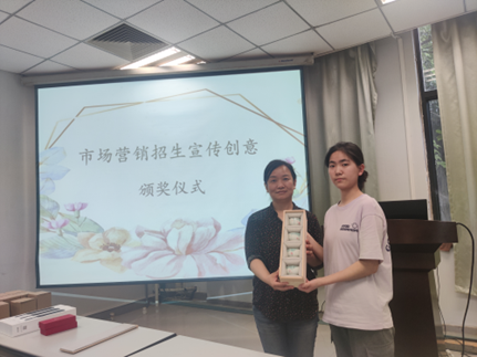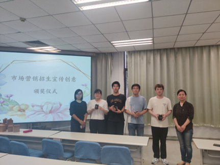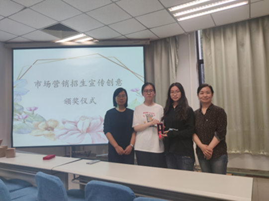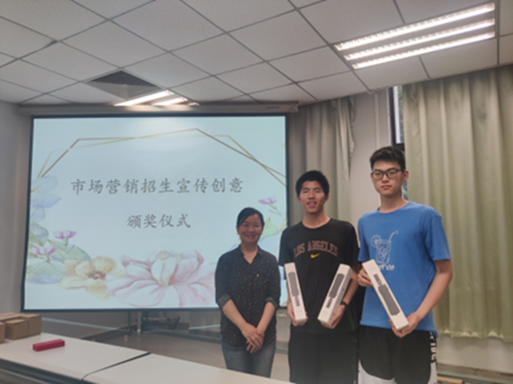 2023年5月31日下午,市场营销招生宣传创意颁奖仪式在一楼导播厅举行。首先,市场营销系主任万宇艳老师向提交策划案的同学表示感谢,通过此次创意征集,学院感受到了同学们建设专业的积极性与创造力,我们对市场营销专业未来的发展充满信心。其次,她向同学们介绍了市场营销专业宣传片的拍摄进展情况。最后,由万宇艳老师和杨柳燕老师共同为获奖同学颁发奖品,希望同学们能够砥砺奋进,与市场营销专业共同进步!