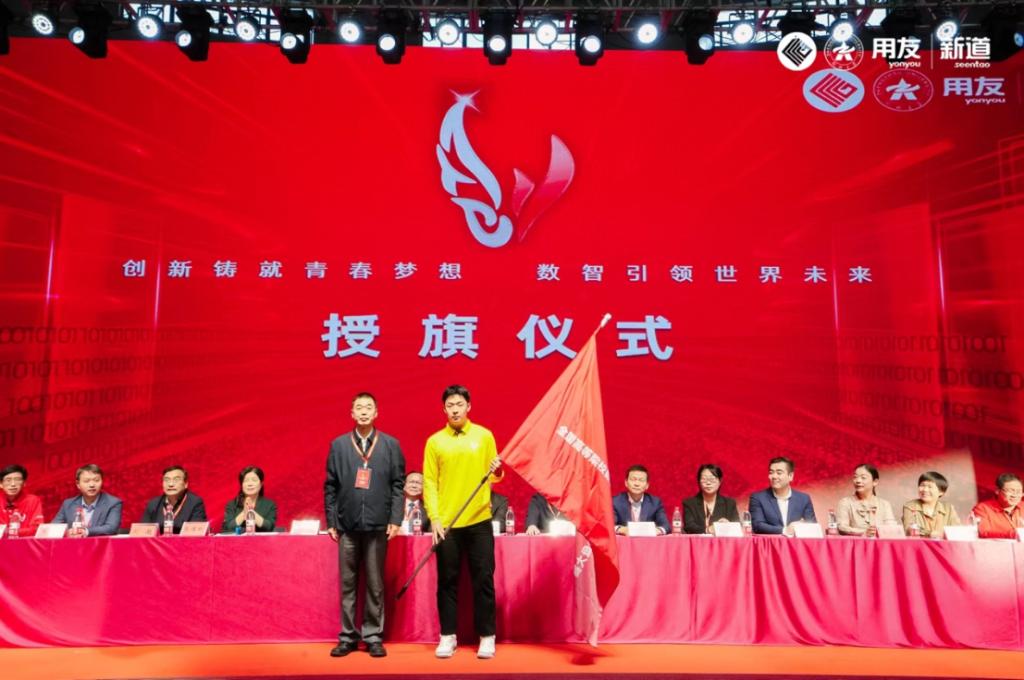 郑州大学党委副书记吴宏阳给参赛选手代表王浩昊同学授旗。
